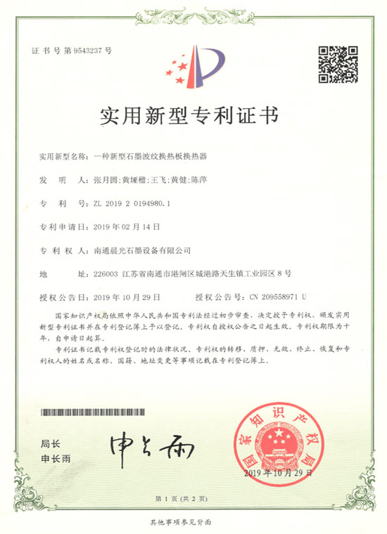 實用新型專利 :石墨換熱器 專利號:ZL 2019 2 1407837.2