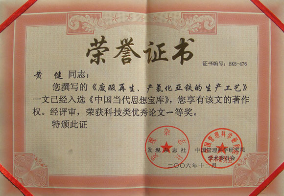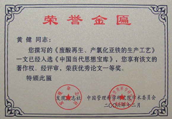 2006年12月,《廢酸再生、產(chǎn)氯化亞鐵的生產(chǎn)工藝》入選《中國當代思想寶庫》