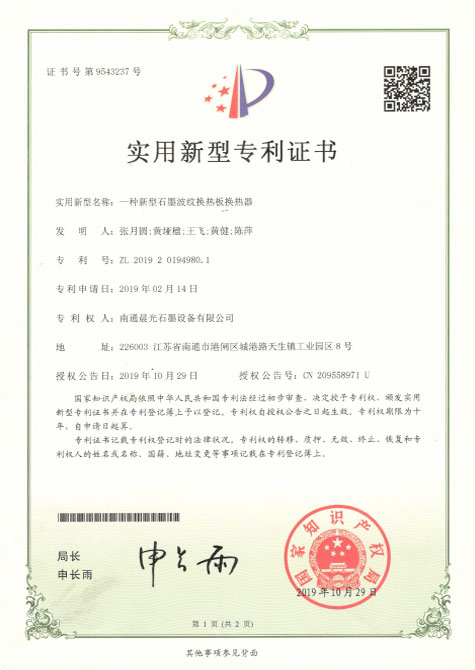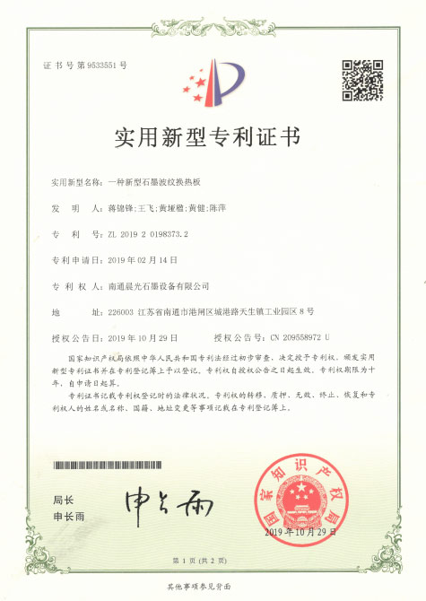 實(shí)用新型專利 :一種新型石墨波紋換熱板 專利號:ZL 2019 2 0198373.2
